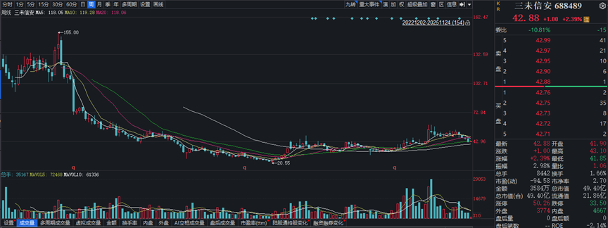 在资本市场,技术不是免死金牌,讲故事不是永动机。三年前,三未信安带着“自主可控、密码安全核心技术”的光环登上科创板。彼时它被视为国产信息安全赛道的稀缺标的,募资时市场追捧,机构投资者热情高涨,股价一度飙升。但资本的拥抱,往往也是考验的开始。公司股价股价触及155元的高点之后一路下探,长期低于发行价,市值腰斩再腰斩,最低点只有20.55元。截至11月24日收盘,三未信安股价42.88元,市值蒸发超过7成,只剩49.40亿元。对一众被套的中小股东而言,这不仅是投资损失,更是一场信任危机。