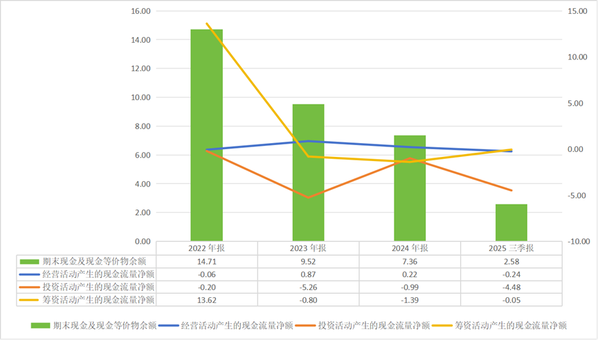 公司在张岳公的主导下大规模并购、频繁出手,仅2025年前三季度投资活动现金流流出高达13.56亿元,而主营业务收入不足3亿元。而且公司的长期资产中还躺着2.21亿元的商誉,这些被收购的企业是否形成了协同?至少从公司的盈利能力上没有体现出来多少。“并购制造增长”未能掩盖主业疲态,结果导致现金流紧张、盈利承压。市场对这种扩张的态度是清晰的——股价长时间处在漫长的下行通道。