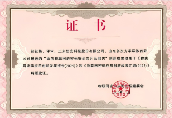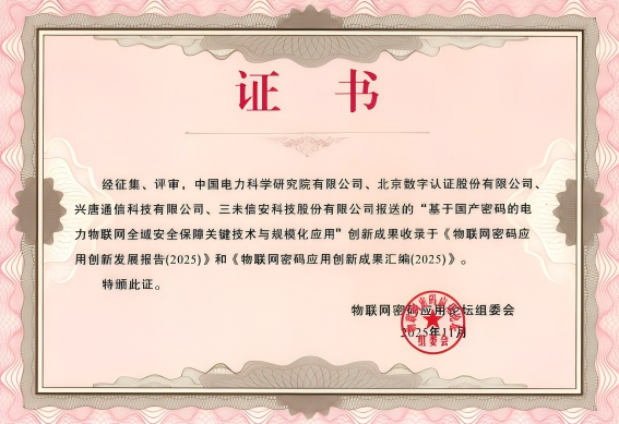 近日, 中国密码学会 物联网密码专业委员会于2025物联网密码应用论坛上正式发布《物联网密码应用创新成果汇编(2025)》和《物联网密码应用创新发展报告(2025)》, 三未信安 科技股份有限公司牵头申报的“面向物联网的密码安全芯片及网关”和参与申报的“基于国产密码的电力物联网全域安全保障关键技术与规模化应用”成功入选,标志着公司在物联网密码应用领域的创新实践获得了行业的高度认可与肯定。