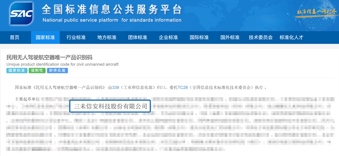12月2日, 国家市场监督管理总局 (国家标准化管理委员会)批准发布强制性国家标准GB 46860-2025《民用无人驾驶航空器唯一产品识别码》(以下简称“标准”), 三未信安 凭借密码方面核心技术优势成为主要起草单位之一,重点参与了“构建存储安全、防篡改技术,传输保护三层防护体系”部分的编制。