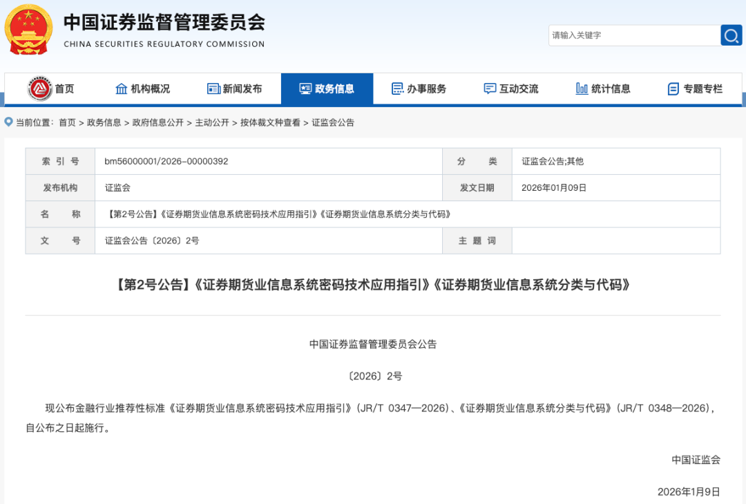 1月9日,中国证券监督管理委员会正式发布并实施两项证券期货行业标准,为行业信息系统的密码应用与分类管理提供统一技术规范。三未信安与子公司江南天安全程参与《证券期货业信息系统密码技术应用指引》(JR/T?0347-2026)编制工作,以专业技术实力赋能行业标准化建设。