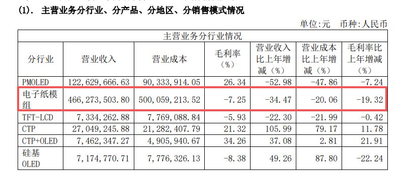 根据公司2024年7月发布的年报问询函回复公告,公司2023年实现营业收入6.61亿元,同比大幅下降36.69%。其中,被寄予厚望的电子纸模组产品收入同比下降34.47%,毛利率为-7.25%。