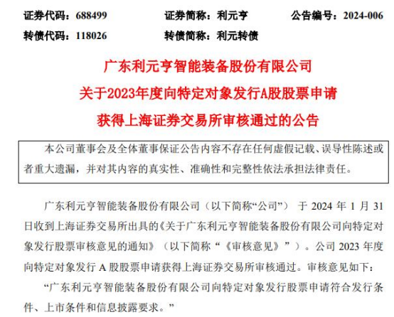 中国经济网北京2月1日讯利元亨(688499.SH)昨晚披露《关于2023年度向特定对象发行A股股票申请获得上海证券交易所审核通过的公告》称,公司于2024年1月31日收到上交所出具的审核意见,公司2023年度向特定对象发行A股股票申请获得上交所审核通过。审核意见如下:“广东利元亨智能装备股份有限公司向特定对象发行股票申请符合发行条件、上市条件和信息披露要求。”