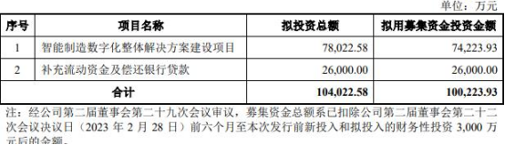 本次向特定对象发行股票募集资金总额不超过100,223.93万元(含本数),扣除发行费用后的净额拟投资于智能制造数字化整体解决方案建设项目、补充流动资金及偿还银行贷款。