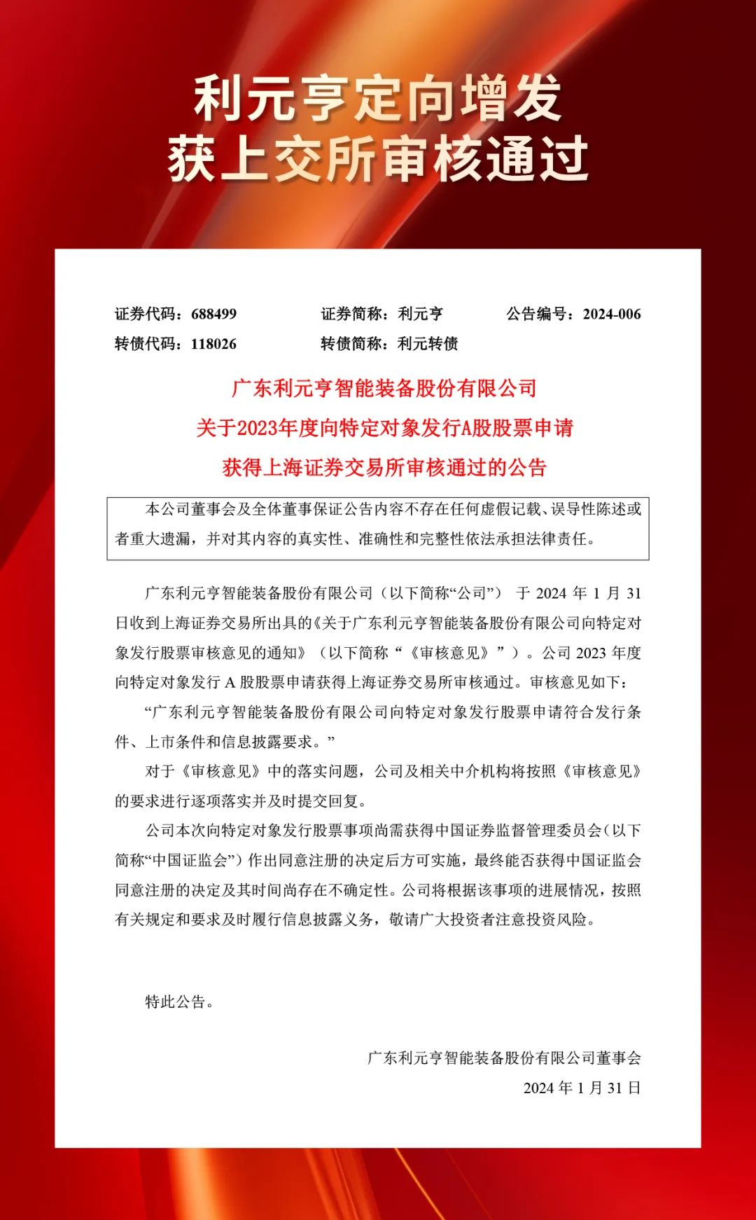 1月31日,利元亨收到上海证券交易所出具的《关于广东利元亨智能装备股份有限公司向特定对象发行股票审核意见的通知》。公司2023年度向特定对象发行A股股票申请获得上海证券交易所审核通过。审核意见如下: