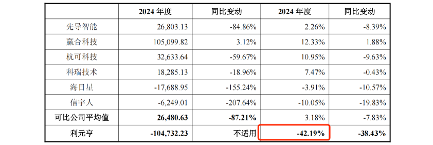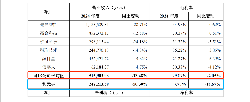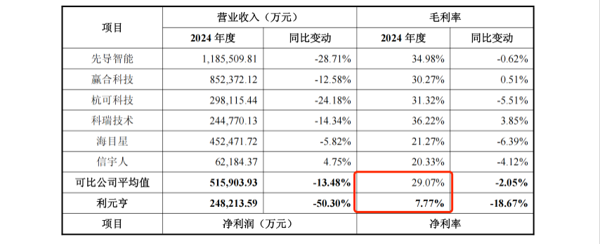 拆解来看,动力锂电设备业务毛利率为-5.29%,同比下滑26.85个百分点;消费锂电设备毛利率虽仍为正,但同比下降18.33个百分点,降至26.19%(回函第3页)。在2024年动力锂电设备收入同比下降63.01%的背景下,其成本却仅下降50.35%,导致直接出现负毛利。同期行业可比公司平均毛利率为29.07%,利元亨的差距不可忽视。