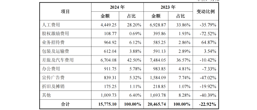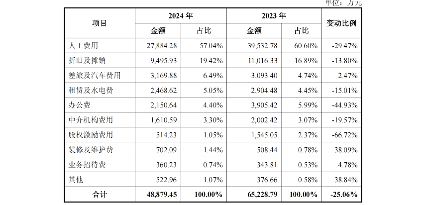 销售费用为1.58亿元,同比下降22.92%,但差旅及汽车费用仍占比42.5%,在业务量大幅下滑情况下保持高频差旅支出,显然与实际经营需求脱节。管理费用为4.89亿元,其中人工成本占比高达57.04%,人员虽同比下降52%,但费用率却升至19.69%(回函第7页),反映内部管理成本粘性强,削减不及时。
