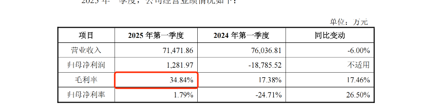 公司已连续两年出现亏损:2023年净利润为-1.88亿元,2024年扩大至-10.44亿元,净利率为-42.19%(回函第2页)。虽然2025年第一季度实现净利润1,281.97万元,毛利率回升至34.84%(回函第10页),但该回升主要系低毛利订单阶段性出清所致,或无法支撑盈利趋势判断。