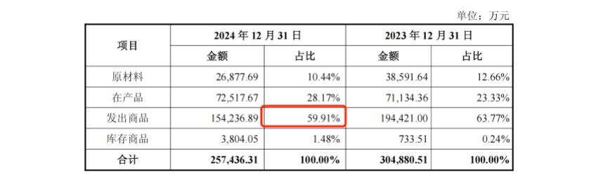 2024年末,公司存货余额为25.74亿元,占总资产的29.28%。其中“发出商品”余额高达15.42亿元,占存货总额的59.91%(回函第27页)。这一比例明显异于行业惯例,或反映出大量设备已发出但未验收,收入确认或存在滞后或错位风险。