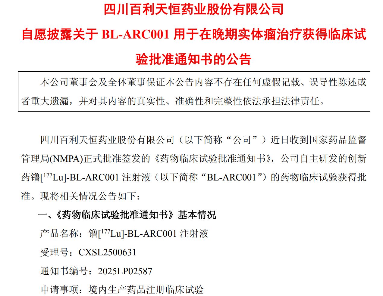 10月8日,百利天恒公告收到《药物临床试验批准通知书》,公司自主研发的创新药镥[177Lu]-BL-ARC001注射液(以下简称“BL-ARC001”)的药物临床试验获得批准。