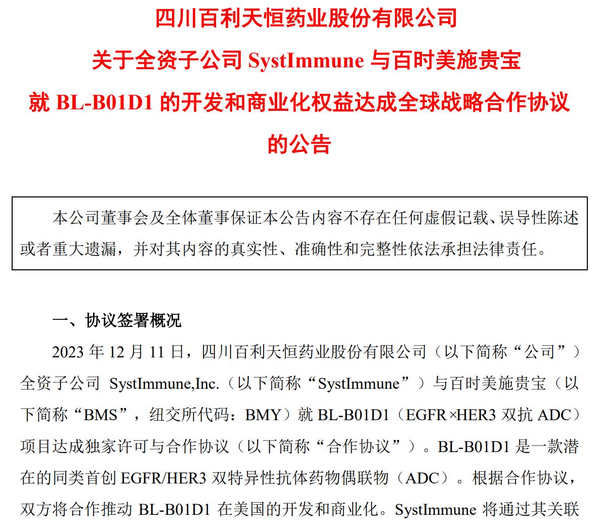 转折点发生在2023年12月12日,百利天恒宣布与知名跨国药企百时美施贵宝(BMS)达成合作协议。根据协议,双方将共同开发百利天恒自主开发的ADC(抗体偶联药物)药物BL-B01D1,该交易潜在总交易额高达84亿美元,其中8亿美元首付款刷新纪录。