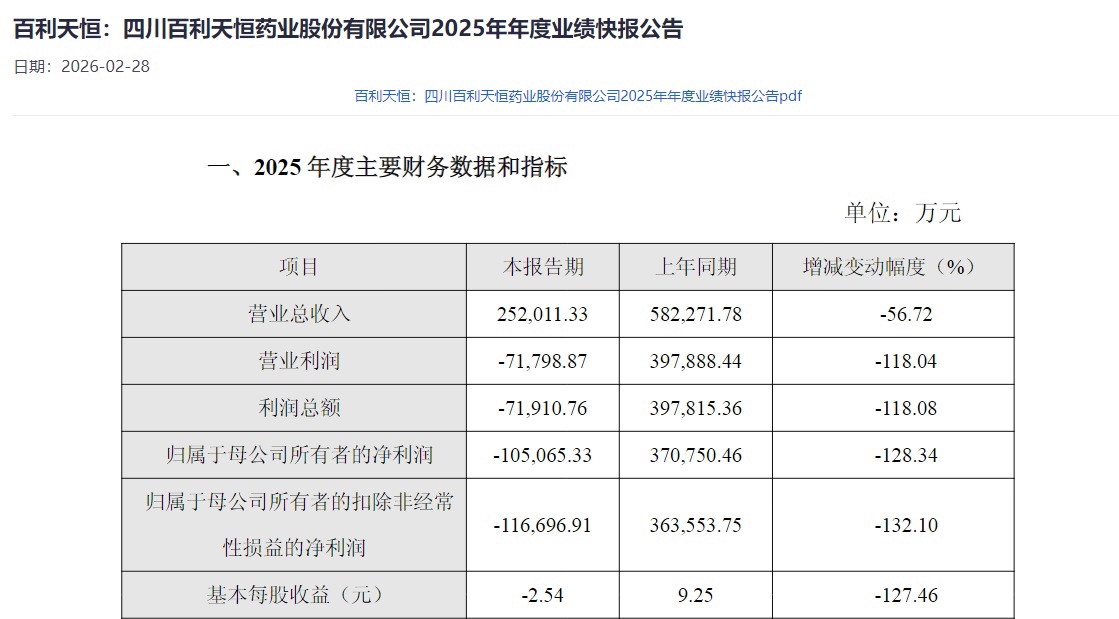 根据百利天恒发布的2025年业绩快报来看,公司全年实现营业总收入252011.33万元,同比减少56.72%;实现归属于母公司所有者的净利润为亏损105065.33万元,同比减少128.34%;归属于母公司所有者的扣除非经常性损益的净利润为亏损116696.91万元,同比减少132.1%。