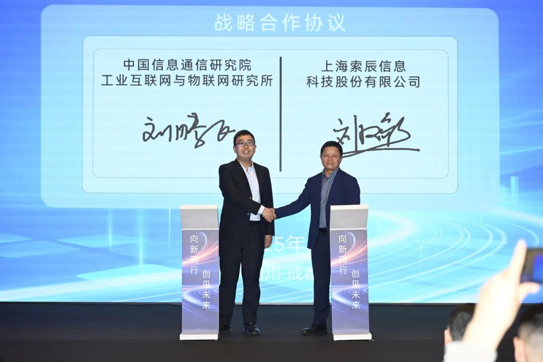 中国信通院工业互联网与物联网研究所未来产业部负责人刘腾飞与索辰科技集团领导刘汉银,分别代表双方完成签约。