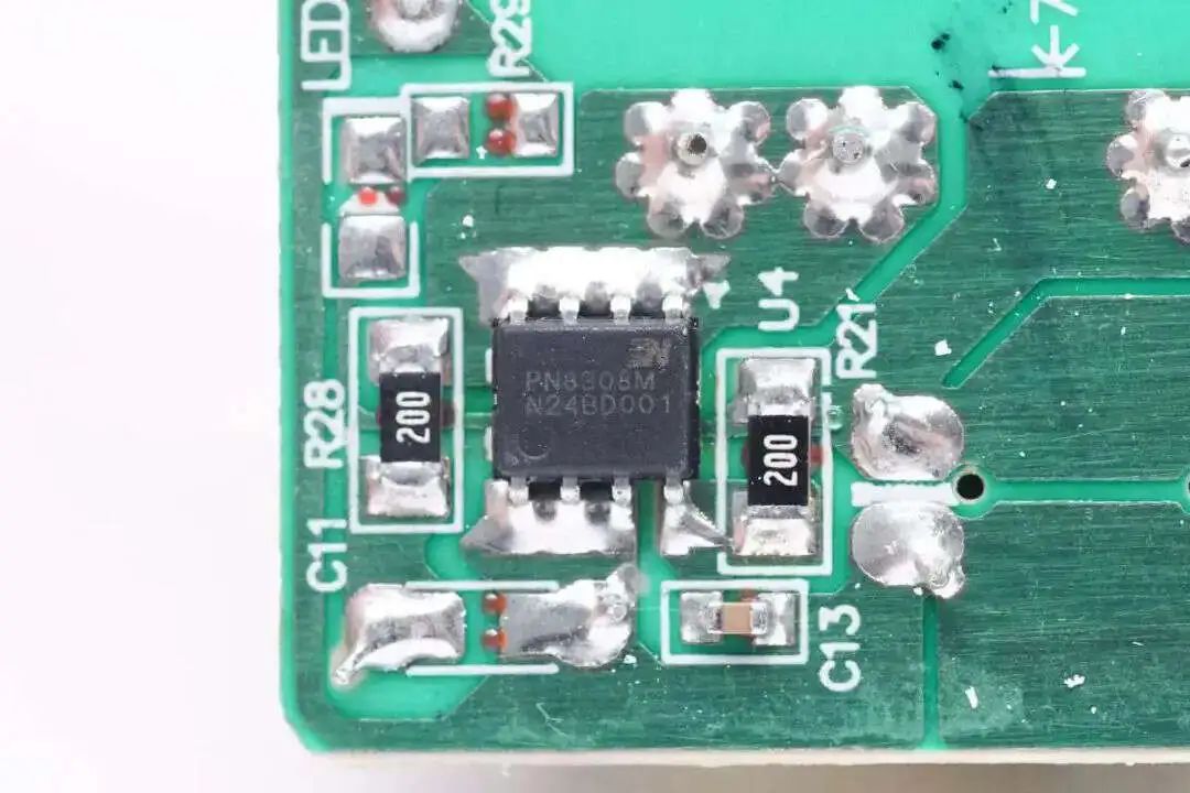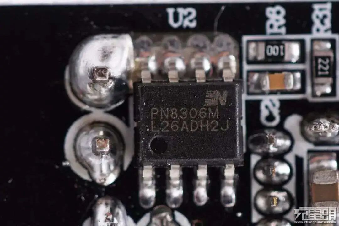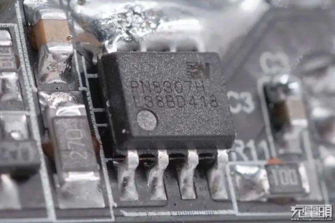 同步整流芯片采用芯朋微PN8307P,集成同步整流控制器及高雪崩能力内置功率MOSFET,用于在高性能ACIDC反激系统中替代次级整流肖特基二极管。