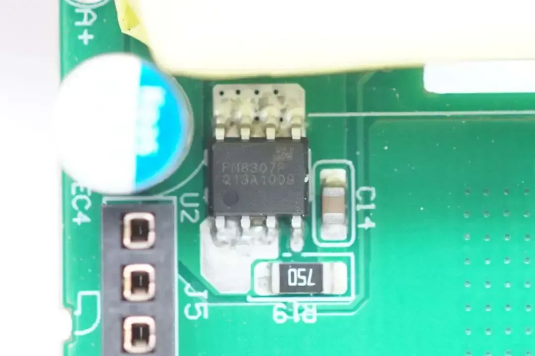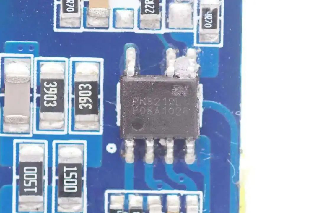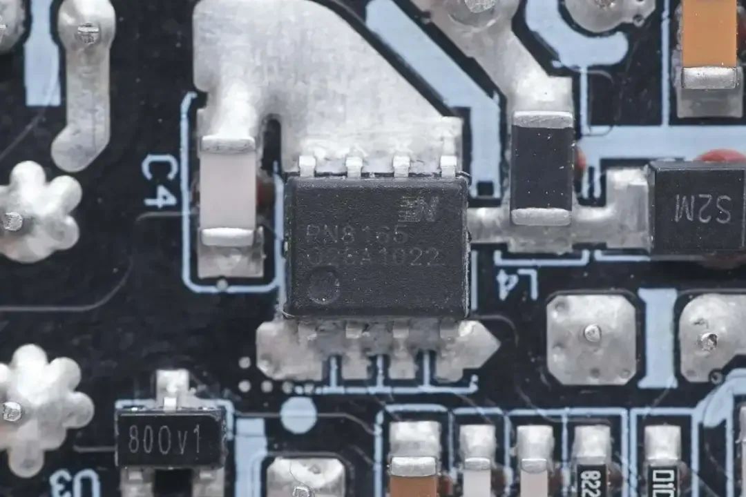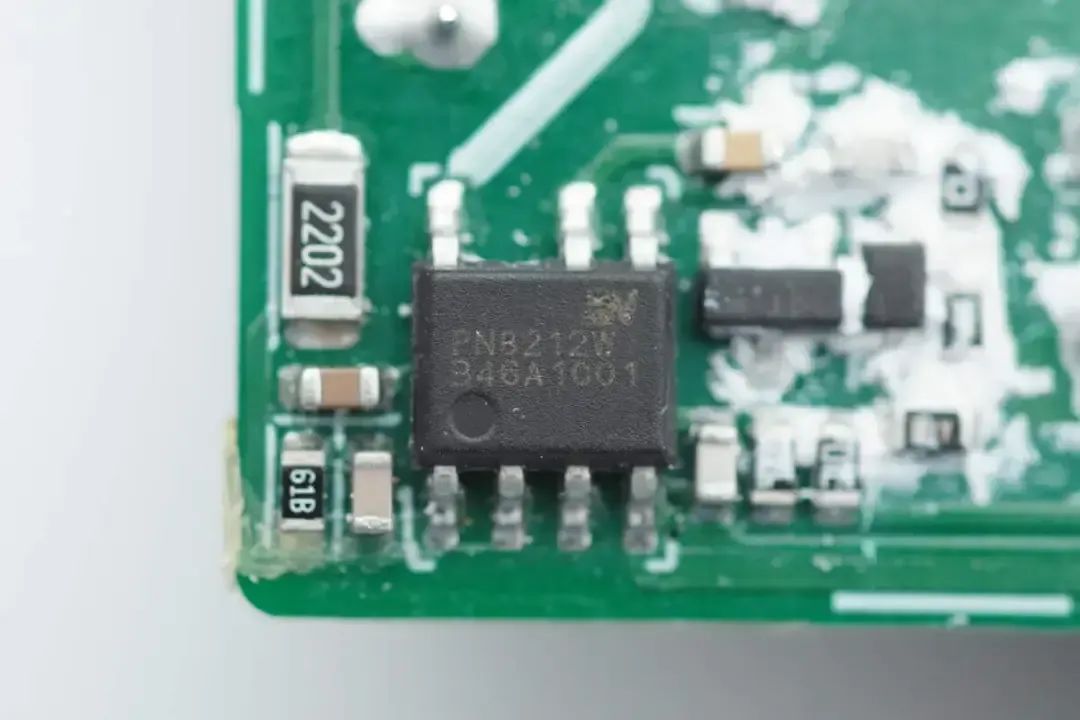 辅助电源芯片来自芯朋微,型号PN8733,芯片内部集成控制器和开关管,具备完善的保护功能。
