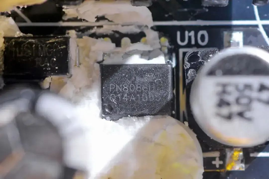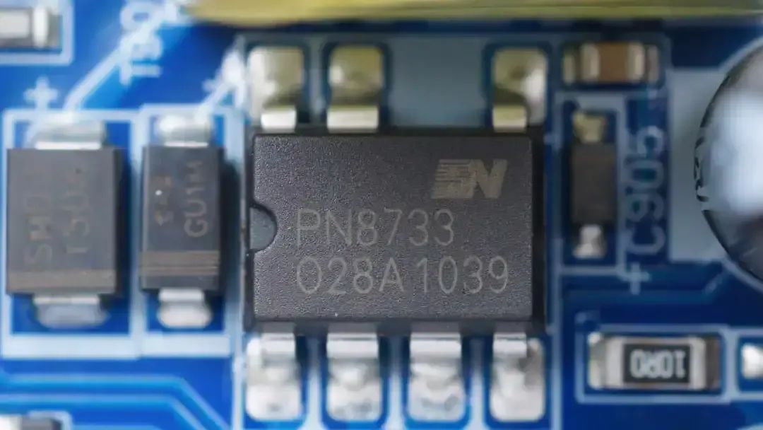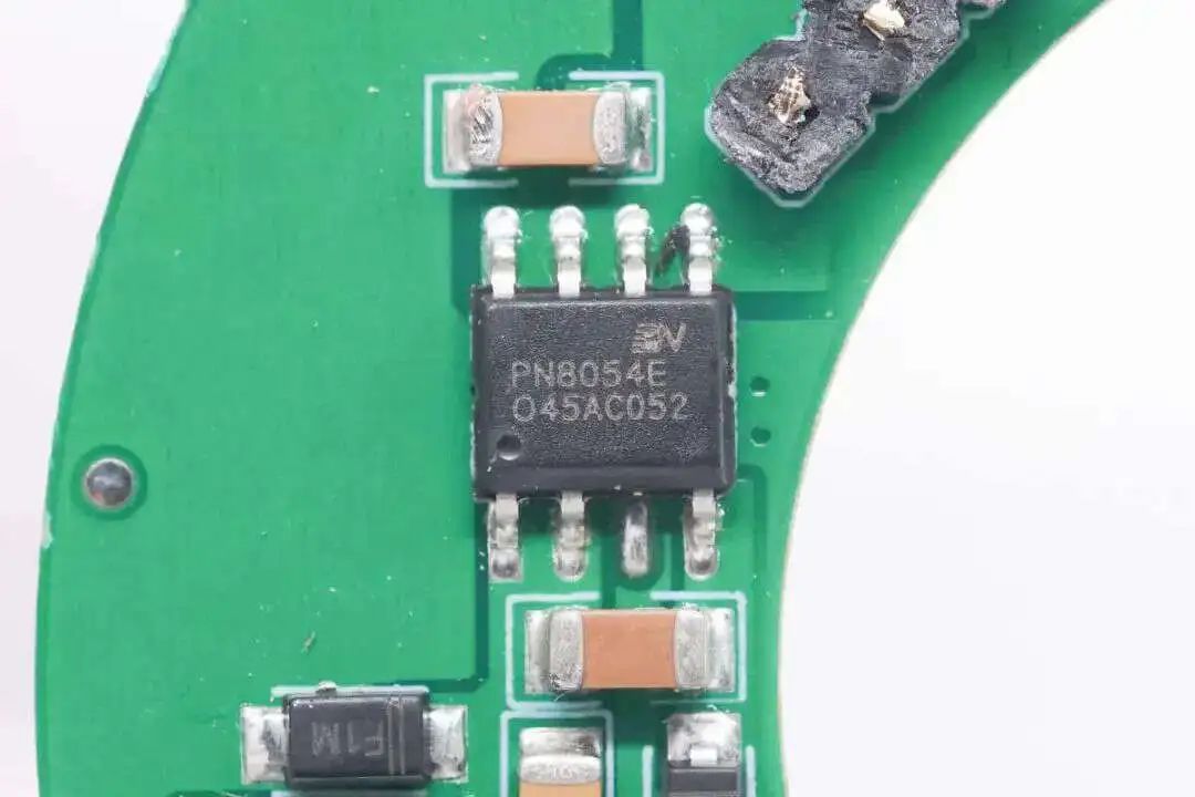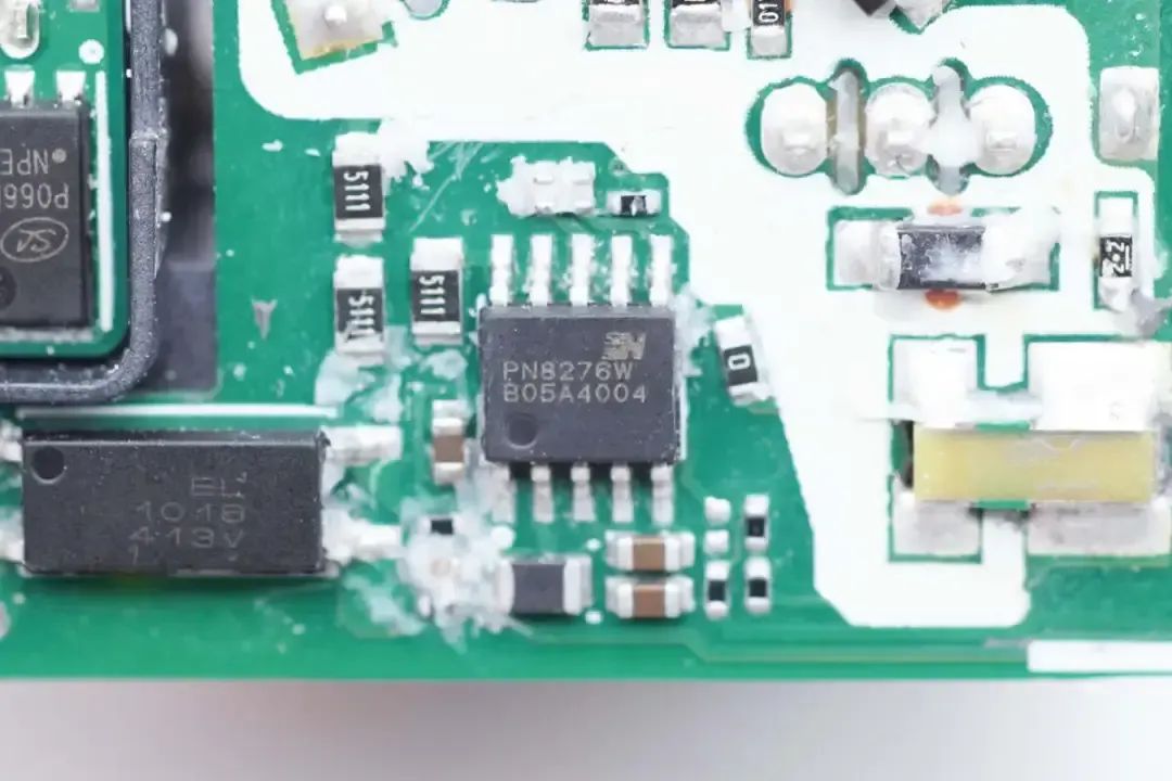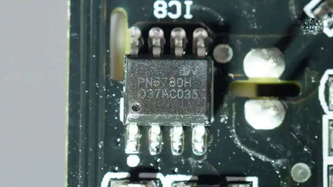 辅助电源芯片来自芯朋微,型号PN8733,芯片内部集成控制器和开关管,具备完善的保护功能。