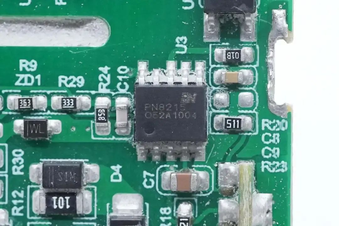 开关电源主控芯片采用芯朋微PN8215,其内部集成了电流模式控制器和高压启动模块,专用于高性能的快速充电开关电源。