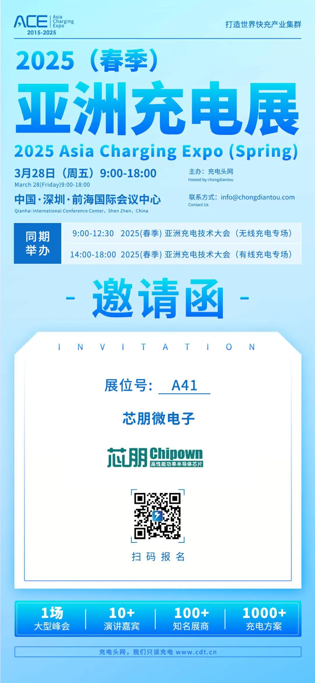 无锡芯朋微电子股份有限公司参加充电头网主办的2025(春季)亚洲充电展,展位号位于A区A41,3月28日欢迎莅临展会现场交流、洽谈。
