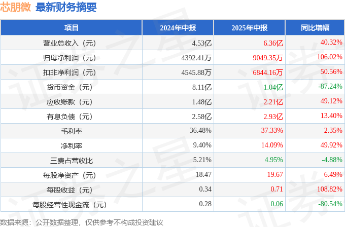 据证券之星公开数据整理,近期芯朋微(688508)发布2025年中报。截至本报告期末,公司营业总收入6.36亿元,同比上升40.32%,归母净利润9049.35万元,同比上升106.02%。按单季度数据看,第二季度营业总收入3.35亿元,同比上升33.88%,第二季度归母净利润4942.05万元,同比上升145.64%。本报告期芯朋微应收账款上升,应收账款同比增幅达49.12%。