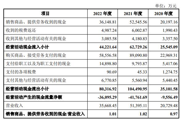 2020年、2021年、2022年,慧智微销售商品、提供劳务收到的现金分别为20,197.16万元、52,545.56万元、36,148.81万元;经营活动产生的现金流量净额分别为-9,556.49万元、-41,761.69万元、-36,095.29万元。