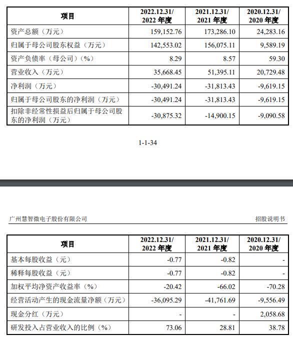 2020年、2021年、2022年,慧智微营业收入分别为20,729.48万元、51,395.11万元、35,668.45万元;归属于母公司股东的净利润分别为-9,619.15万元、-31,813.43万元、-30,491.24万元;扣除非经常性损益后归属于母公司股东的净利润分别为-9,090.58万元、-14,900.15万元、-30,875.32万元。