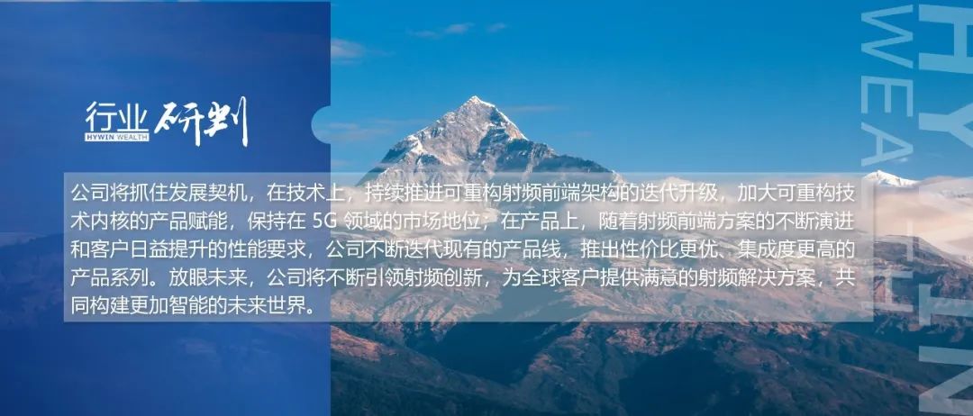 ??公司将抓住发展契机,在技术上,持续推进可重构射频前端架构的迭代升级,加大可重构技术内核的产品赋能,保持在 5G 领域的市场地位;在产品上,随着射频前端方案的不断演进和客户日益提升的性能要求,公司不断迭代现有的产品线,推出性价比更优、集成度更高的产品系列。放眼未来,公司将不断引领射频创新,为全球客户提供满意的射频解决方案,共同构建更加智能的未来世界。