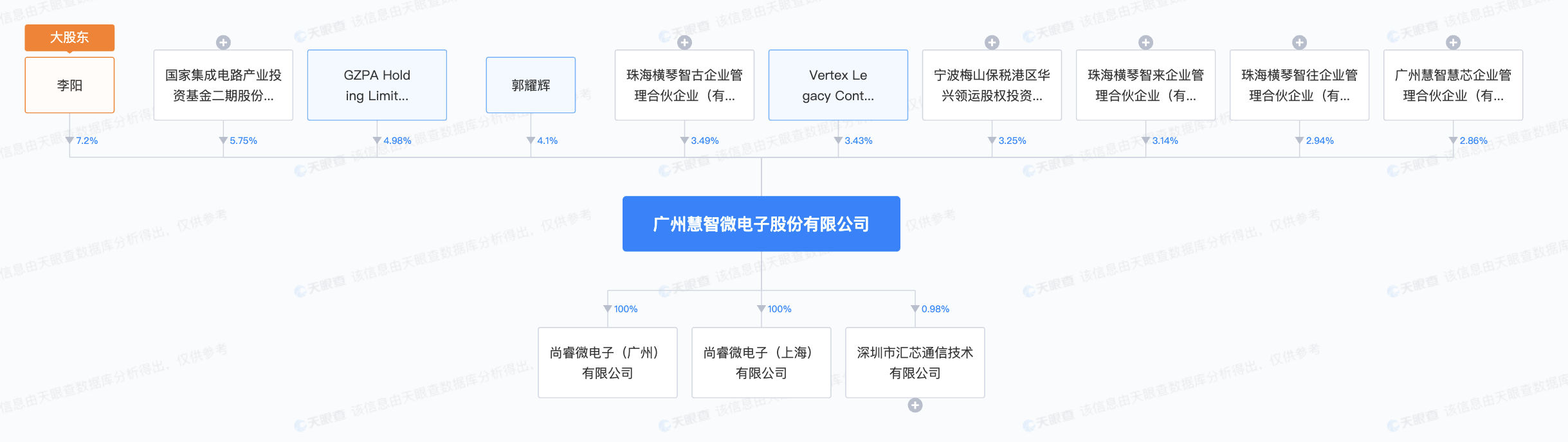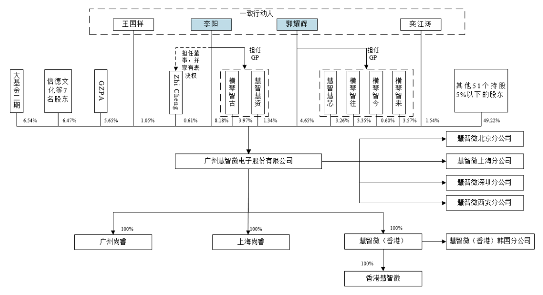 本次上市前,慧智微的控股股东、实际控制人为李阳、郭耀辉,二人合计直接持有慧智微12.84%股份,通过慧智慧资、横琴智古、Zhi Cheng、慧智慧芯、横琴智往、横琴智今、横琴智来等7家持股平台控制慧智微16.70%的表决权。