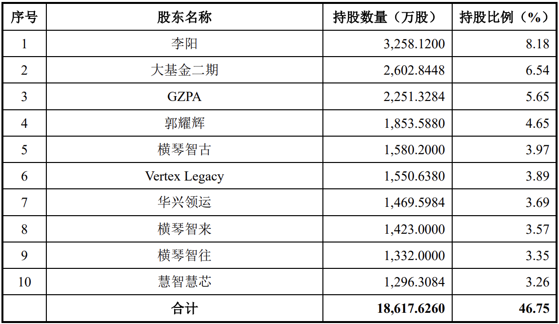 IPO前,李阳直接持股8.18%,郭耀辉直接持股4.65%,奕江涛持股1.54%,王国样持股1.05%,慧智慧资持股1.34%,横琴智古持股3.97%,Zhi Cheng持股0.61%,慧智慧芯持股3.26%,横琴智来、横琴智往、横琴智今分别持股3.57%、3.35%和0.60%。