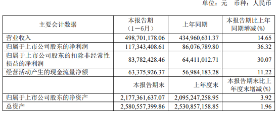 归属于上市公司股东的净利润117,343,408.61元,同比增长36.32%,主要系:(1)公司产品富马酸比索洛尔片、伊班膦酸钠注射液、依托考昔片销量增加;(2)公司使用闲置资金购买的理财产品相关投资收益及公允价值变动收益增加;(3)公司报告期内可加计扣除的研发费用较上年同期增加,导致所得税费用较同期减少。