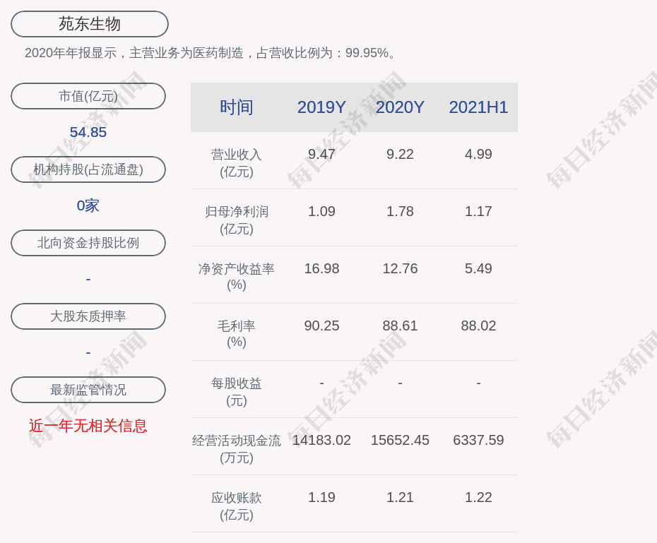 2020年年报显示,苑东生物的主营业务为医药制造,占营收比例为:99.95%。
