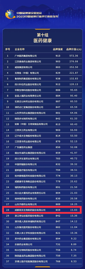 成都苑东生物制药股份有限公司再次以品牌价值15.83亿元(2022年为11.50亿元、2021年为10.70亿元)荣登中国品牌价值评价“医药健康”组榜单,品牌价值得到持续量化并实现增值。逐年提升的品牌价值和品牌影响力,印证了苑东生物的高质量发展。