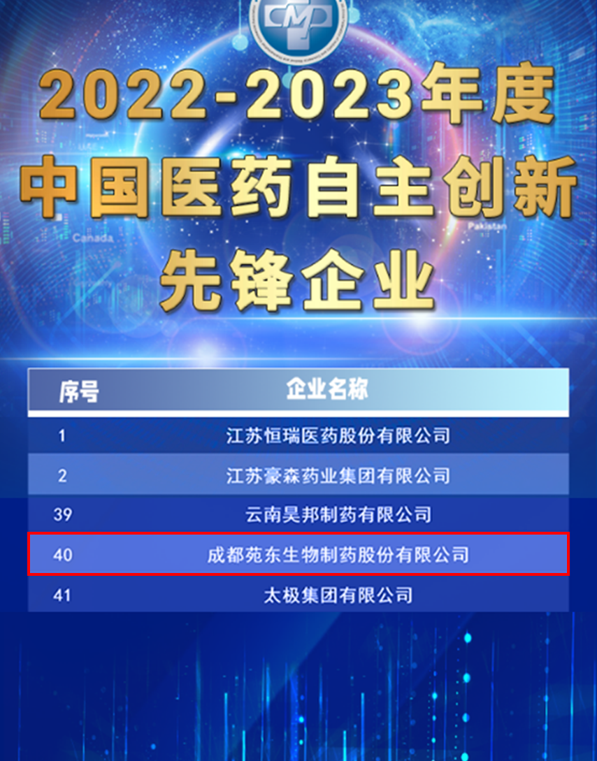 会上隆重发布了中国医药制造业百强、中国医药研发50强、中国医药行业十大领军人物、中国医药业创新先锋人物、中国医药商业百强、中国连锁药店50强等12项榜单。成都苑东生物制药股份有限公司荣膺2022-2023年度中国医药自主创新先锋企业50强,彰显了公司在自主创新方面的卓越实力。