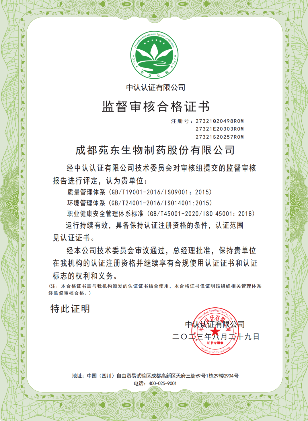 2023年8月15日至17日,中认认证有限公司专家组一行四人来到成都苑东生物制药股份有限公司(高新西区制造基地),对公司“质量、环境、职业健康安全管理”体系的运行情况进行了监督审核。通过三天来专家们严格细致的检查,成都苑东生物制药股份有限公司一次性零缺陷通过了全部审核。
