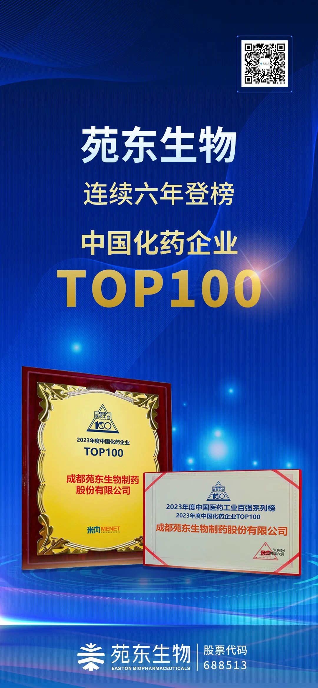近日,2023年中国医药工业百强榜单在湖州揭晓。成都苑东生物制药股份有限公司(股票代码:688513)再次登榜“2023年度中国化药企业TOP100”,这是公司自2018年以来,连续六年入围中国医药工业百强榜单。