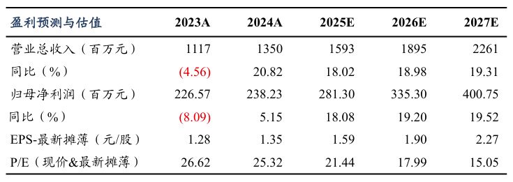 事件:公司近期发布2024年及2025年一季度财报,2024年实现营业收入13.50亿元(+20.82%,括号内为同比,下同),实现归母净利润2.38亿元(+5.15%),实现扣非归母净利润1.75亿元(+10.90%),剔除股权激励费用影响,归母净利润同比+13.47%,扣非归母净利润同比+22.87%。25Q1单季度实现营业收入3.06亿元(-2.97%),实现归母净利润0.61亿元(-19.22%),实现扣非归母净利润0.46亿元(-10.79%),25Q1利润受股权激励费用短期承压。
