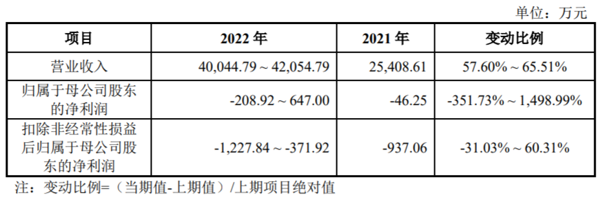 2022 年,裕太微预计营业收入金额为 40,044.79 万元至 42,054.79 万元,变动比例为57.60%至 65.51%;预计归属于母公司股东的净利润金额为-208.92 万元至 647.00 万元,变动比例为-351.73%至 1,498.99%;扣除非经常性损益外归属于母公司股东的净利润金额为-1,227.84 万元至-371.92万元,变动比例为-31.03%至60.31%,全年仍有可能小幅亏损,主要系公司发生大额流片费用,且研发人员规模上升所致。