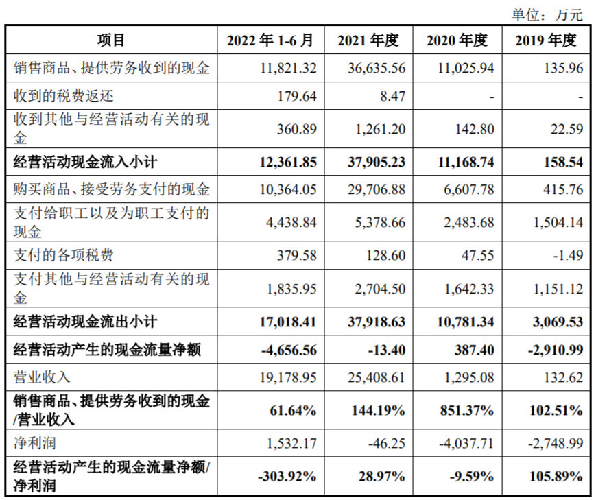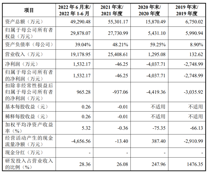 2019 年至2021年,裕太微的营业收入分别为 132.62 万元、1,295.08 万元、25,408.61 万元;净利润/归属于母公司所有者的净利润分别为-2,748.99万元、-4,037.71万元、-46.25万元;扣除非经常性损益后归属于母公司所有者的净利润分别为-3,035.92万元、-4,419.36万元、-937.06万元;经营活动产生的现金流量净分别为-2,910.99万元、 387.40万元、-13.40万元。截至 2021 年 12 月31 日,公司尚未盈利且存在累计未弥补亏损。