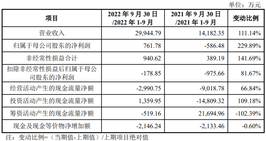 2022 年 1-9 月,公司营业收入为 29,944.79 万元,变动比例为111.14%;归属于母公司股东的净利润为 761.78 万元,变动比例为229.89%;扣除非经常性损益后归属于母公司股东的净利润为-178.85 万元,变动比例为81.67%;公司经营活动产生的现金流量净额为-2,990.75 万元,变动比例为66.84%。