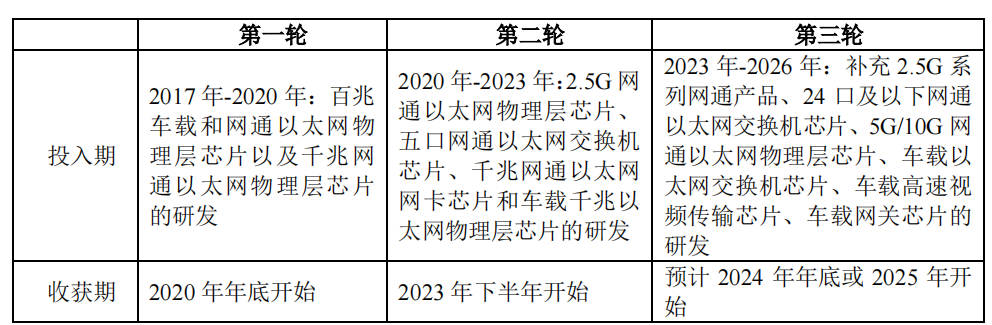 裕太微表示,公司目前已进入第三轮研发投入期,该轮次研发投入金额较大,研发投入周期较长,研发产品难度系数大幅提升。该轮次核心研发投入为补充2.5G系列网通产品、24口及以下网通交换机芯片、5G/10G网通以太网物理层芯片、车载以太网交换机芯片、车载高速视频传输芯片、车载网关芯片。这一系列产品将陆续于2024年到2026年量产出货,为后续的营收份额的提升做出贡献。