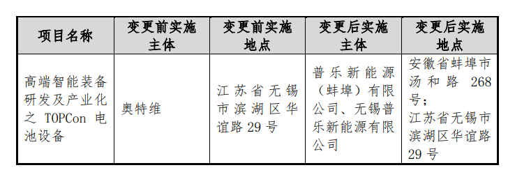 此次变更募投项目为高端智能装备研发及产业化之 TOPCon 电池设备项目。该项目之前的实施主体为奥特维,建设地点在江苏无锡,变更后的实施主体为普乐新能源,地点为安徽蚌埠以及江苏无锡。