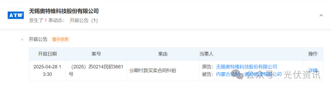 近日【光伏资讯】微信公众号(PV-info)了解到,据公开消息,无锡奥特维新增一条开庭信息。