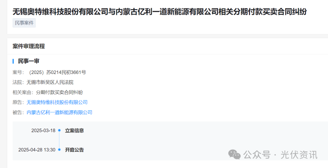 据了解,该案件于3月18日立案,并将于4月28日开庭。因分期付款买卖合同纠纷,无锡奥特维股份状告内蒙古亿利一道新能有限公司,审理法院为无锡市新吴区人民法院,案号为(2025)苏0214民初3661号。