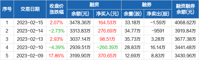 融资方面,当日融资买入617.76万元,融资偿还453.23万元,融资净买入164.53万元,连续3日净买入累计539.73万元。融券方面,融券卖出3.73万股,融券偿还5.32万股,融券余量33.18万股,融券余额590.26万元。融资融券余额合计4068.62万元。