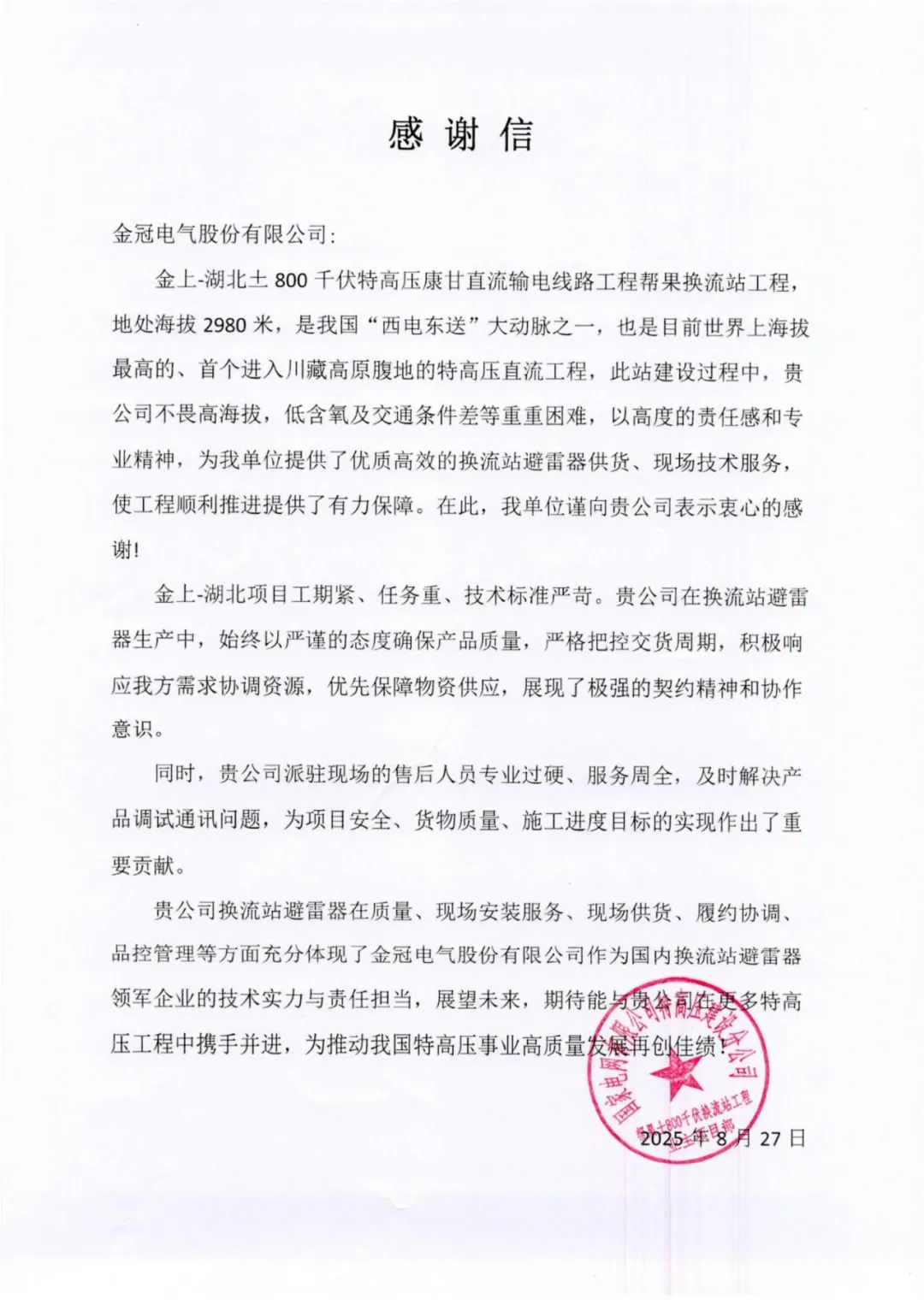 这封感谢信不仅是对公司产品与服务的充分肯定,更是对公司积极参与国家重大工程、服务能源发展战略的认可与鼓励。未来,金冠电气将以此为契机,持续提升技术创新能力与服务品质,为国家特高压电网建设贡献更多力量。