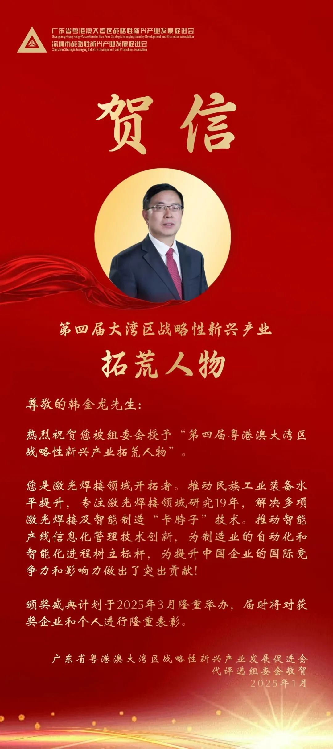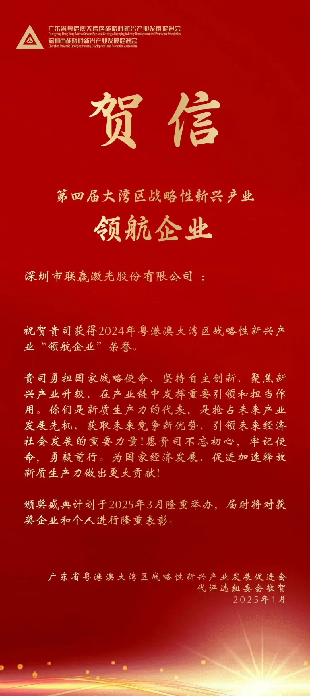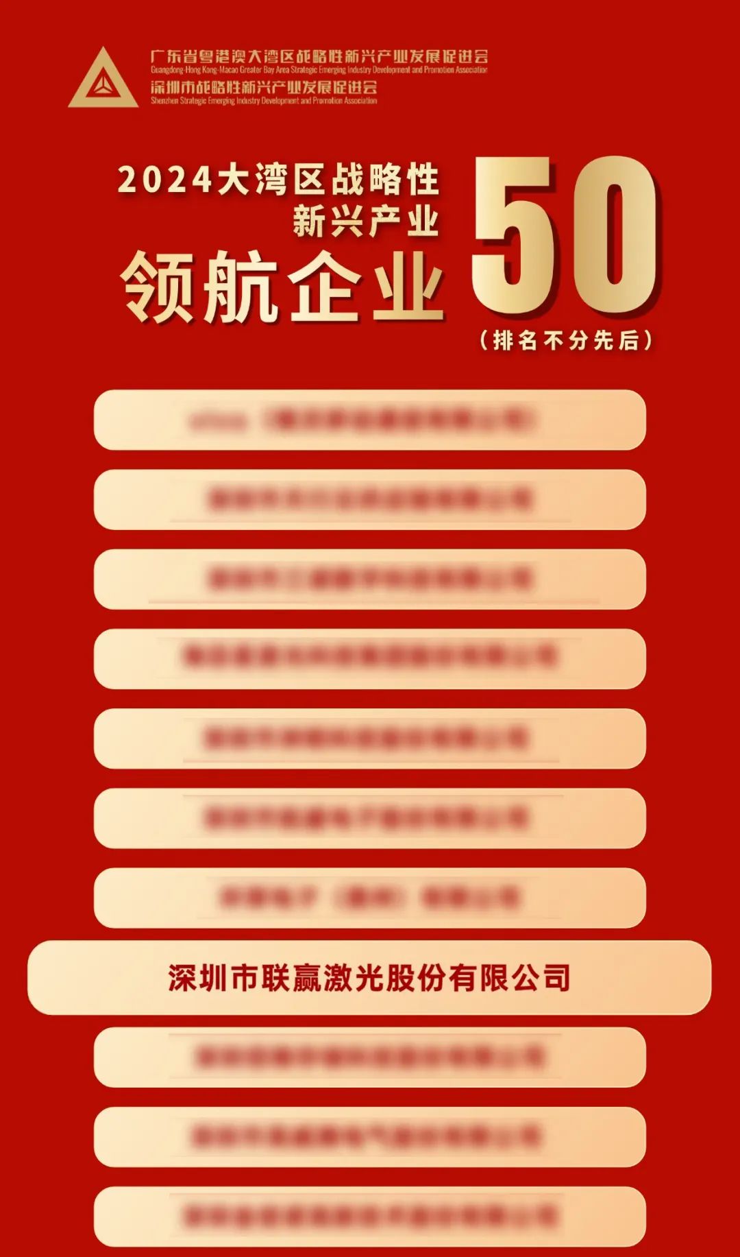 近日,2024年大湾区战略性新兴产业领航企业暨第四届大湾区战略性新兴产业“拓荒人物”、“青年领袖”评选结果揭晓。深圳市联赢激光股份有限公司成功入选“领航企业”榜单,联赢激光创始人、公司董事长韩金龙先生获评“拓荒人物”荣誉称号。