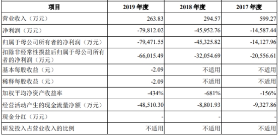 招股书显示,2017年至2019年,营业收入分别为599.27万元、294.57万元、263.83万元,归属于母公司所有者的净利润分别为-14,127.96万元、-45,325.82万元、-79,471.55万元,扣除非经常性损益后归属于母公司所有者的净利润分别为-20,556.61万元、-32,054.69万元、-66,015.49万元,经营活动产生的现金流量净额分别为-9,327.86万元、-8,801.93万元、-48,510.30万元。