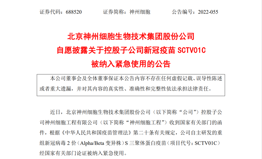 2022年12月4日,神州细胞发布公告,近日,北京神州细胞生物技术集团股份公司(以下简称“公司”)控股子公司神州细胞工程有限公司(以下简称“神州细胞工程”)收到国家有关部门的函件,根据《中华人民共和国疫苗管理法》第二十条有关规定,公司自主研发的组新冠病毒 2 价(Alpha/Beta 变异株)S 三聚体蛋白疫苗(项目代号:SCTV01C)经国家有关部门论证被纳入紧急使用。