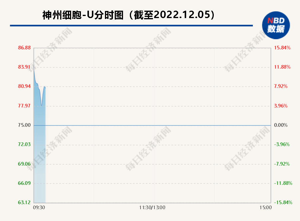 今日(12月5日),神州细胞(SH688520,股价75元,市值334亿元)高开低走。