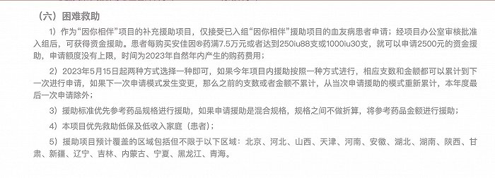 现金返还补贴的细则未在“因你同行”官网中展示,但在2023年7月5日于某省市血友之家官网发布的公告中一篇标题为“2023因你相伴-血友病患者公益项目上线啦!”的通知中透露的另一项慈善项目中则有相似的现金返还的规则。