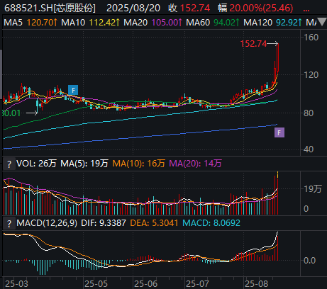 从阶段性表现来看,芯原股份自8月4日收盘以来涨势凌厉,截至今日最大涨幅达61.65%,区间最高价152.74元正是今日创出,显示出强劲的上涨动能。